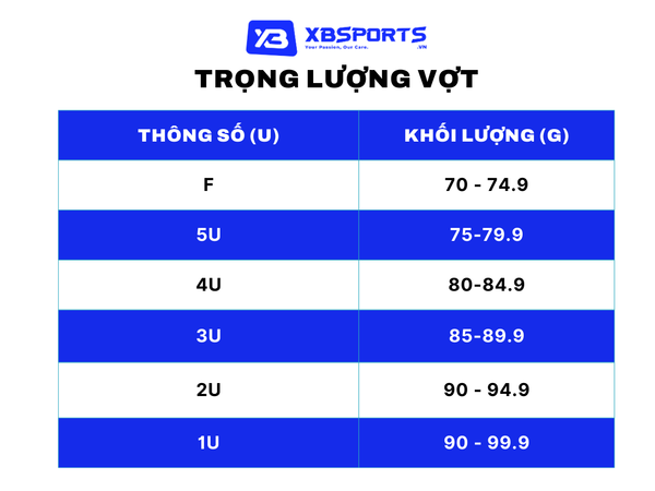 Với người mới bắt đầu thì 3U (85 – 89 gr) là vợt có trọng lượng vừa phải, phù hợp với nhiều độ tuổi và giới tính khác nhau. Phụ nữ và trẻ em có thể chọn loại nhẹ hơn như 4U (79 – 83gr) hoặc 5U (dưới 80gr). Đối với các vận động viên chuyên nghiệp và những người có lực tay khỏe thì 2U (90-94 gr) cũng là một lựa chọn.