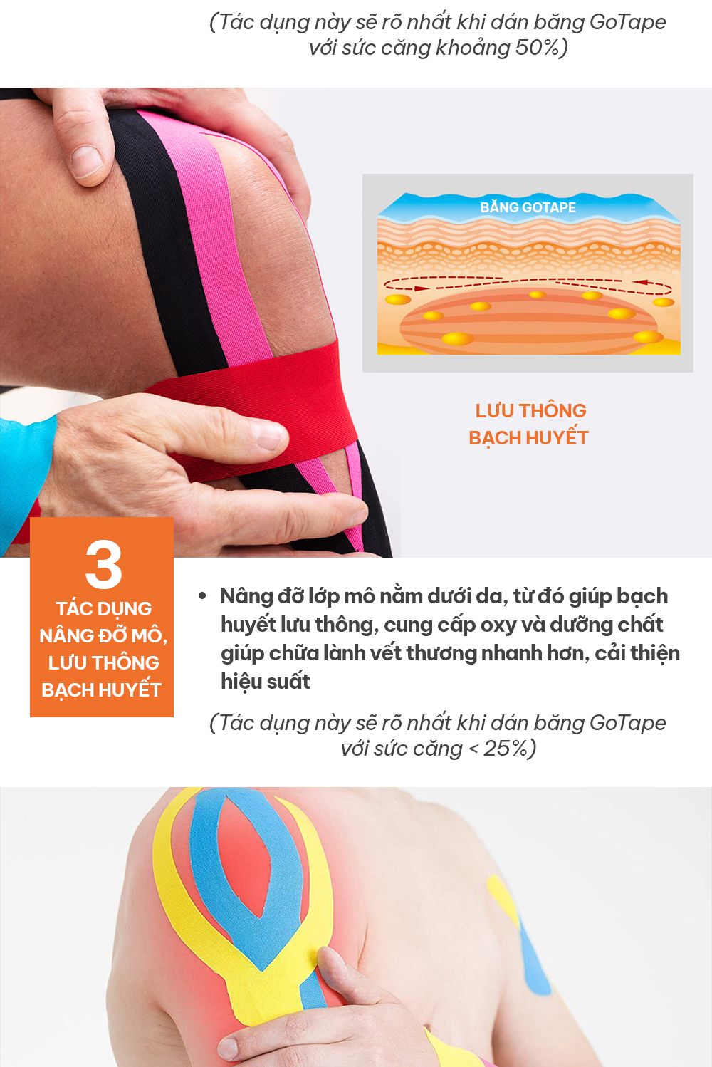 Băng GoTape có chức năng nâng đỡ mô (lớp mô nằm dưới da), từ đó giúp bạch huyết lưu thông, cung cấp oxy và dưỡng chất đến các vùng vận động giúp chữa lành vết thương nhanh hơn, hoặc cải thiện hiệu suất của vùng hoạt động. Đây cũng chính là nguyên lý được các bác sĩ trị liệu sử dụng trong hỗ trợ điều trị cho bệnh nhân được y học chính thức công nhận.