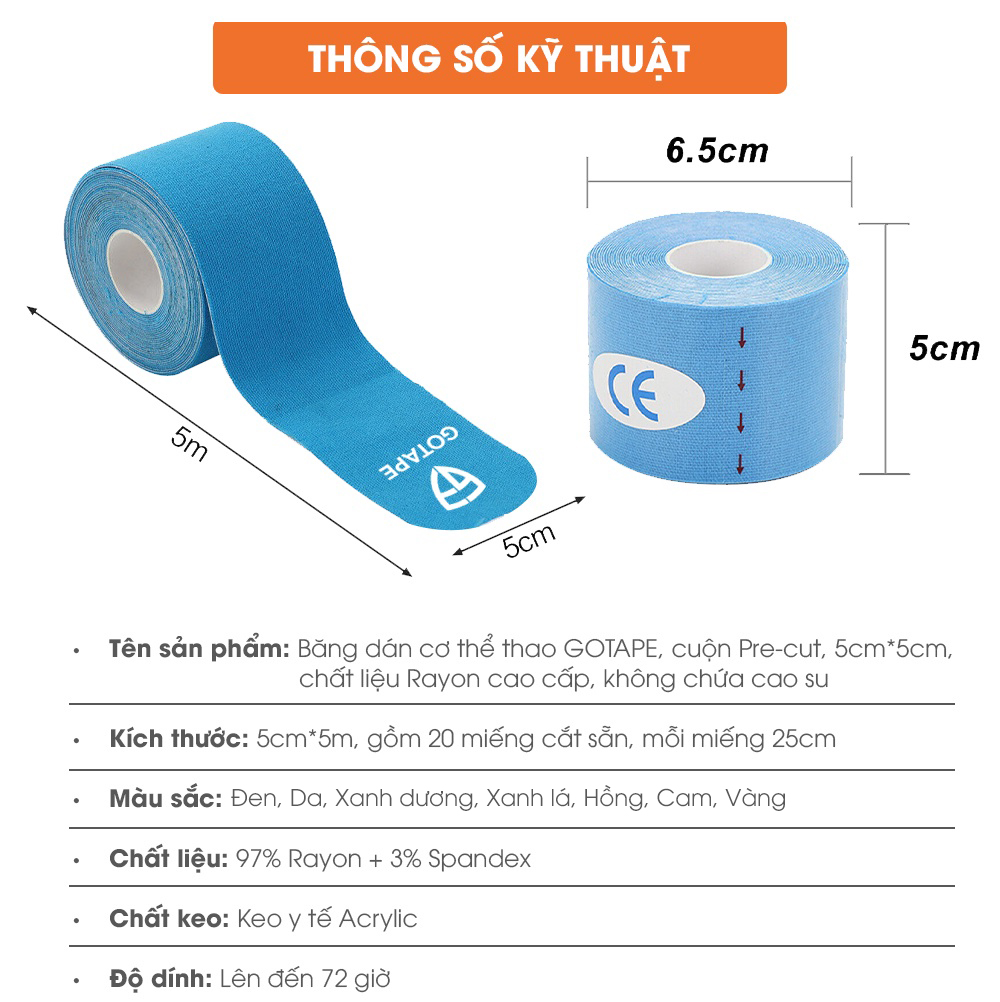 - Kích thước: 5cm*5m, gồm 20 miếng cắt sẵn, mỗi miếng 25cm