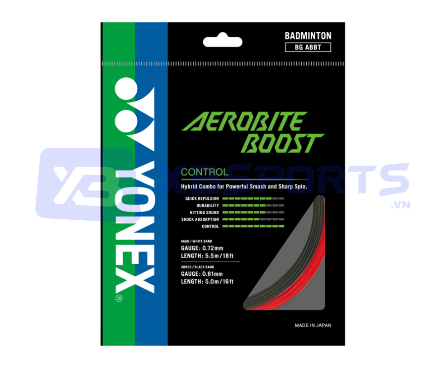 - Dây cước căng vợt Yonex BG Aerobite Boost hướng đến người chơi phong trào, bán chuyên, chuyên nghiệp, vận động viên đang tìm kiếm cho mình một sợi cước có độ cứng mặt vợt, độ nảy cao, cho khả năng kiểm soát cầu tốt nhất trên sân.