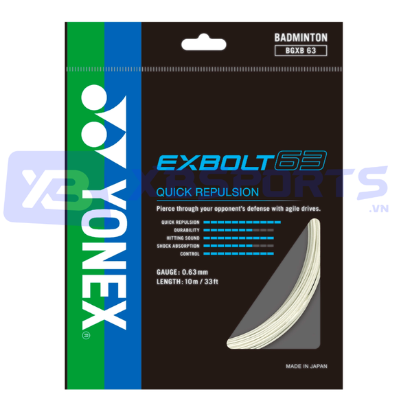 Yonex BG EXBOLT 63 là dòng cước cao cấp của Yonex, được thiết kế dành cho người chơi yêu thích cảm giác đánh bùng nổ với lực đẩy cao, kiểm soát tốt đi kèm với âm thanh nổ to. Với đường kính mảnh chỉ 0.63mm, cước mang đến khả năng tạo lực cầu uy lực, tốc độ đi cầu nhanh cùng âm thanh vang dội khi tiếp xúc.